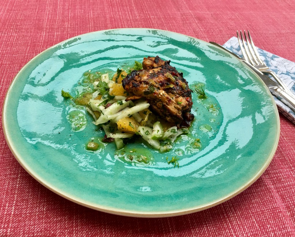 Once the juices are running clear, let the chicken rest for five minutes before serving with the salad and the dressing drizzled around it. Add lots of extra fresh mint/coriander/parsley/fennel. A scattering of sumac is a nice addition.